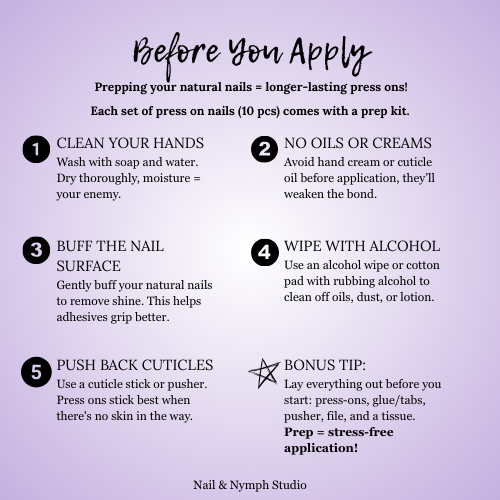 - OPTIONAL application kit (adhesive tabs, mini nail file, cuticle pusher, buffer, instructions)