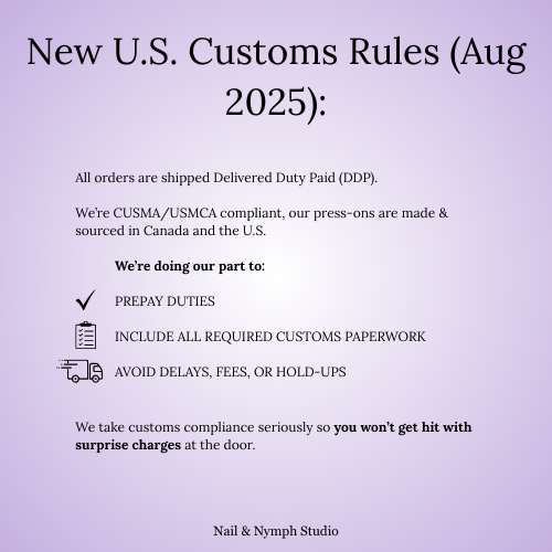 Your order will arrive smoothly, fully labelled as 'Made in Canada,' and ready for your next glamorous moment. If you have any questions about U.S. shipping or customs, feel free to reach out before ordering. I’ve got your back (and your nails)!