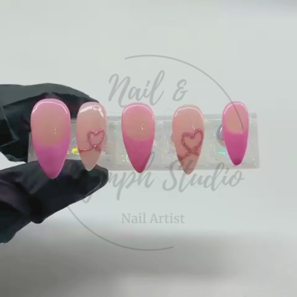 One of my favorite sets, all of the delicate art designs really makes this set pop. With pink french tips, nude base, iridescent pink chrome and heart glitter designs, everyone will be jealous of your gorgeous nails.